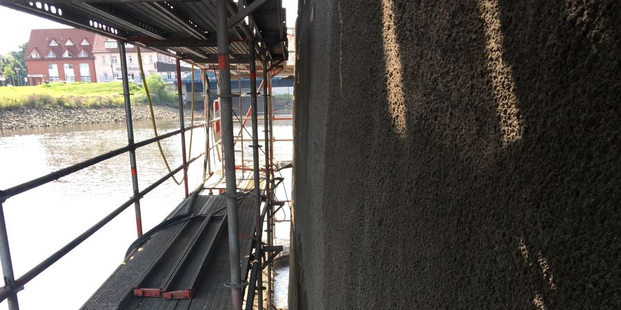 The 80 m long bridge with a passage height for ships of three metres at normal high water was built in 1872 on huge concrete piers. Local politicians began voicing fears in 2015 that the ageing railway bridge might no longer be sufficiently stable. Earlier, passers-by had reported damage to the massive pier structures on which the construction with its steel superstructures rests. At low tide, it became apparent that the lower section of the central bridge pier had been eroded by the waters of the Lesum, which flows very fast at this point. Deutsche Bahn reported that the stability of the bridge, which is regularly inspected, was not at risk. Nevertheless, they decided to institute timely concrete repairs to the central pier so as to ensure the full long-term availability of the bridge. This turned out to be a particularly demanding task: Due to the high tidal range of three metres, the bridge pier could only be strengthened when the river was at low tide – a very narrow timeframe.